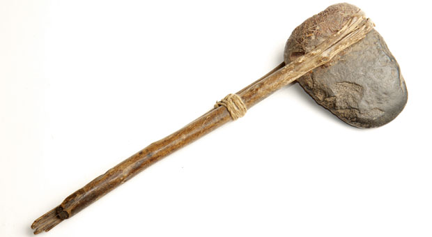 An Aboriginal stone axe head, also called a ‘ground-edge hatchet’, was found in a road cutting behind St Mary’s Cathedral in 1876. The hatchet would have started its life as a large flat river pebble made of hard, volcanic stone which Aboriginal people collected or quarried. It would have been ground down to form a sharp edge for chopping. Grooves in sandstone outcrops near rock pools or creeks around Sydney show that these were places where stone hatchets were fashioned into their final form. The hatchet heads were tied and glued (with resin) onto a wooden handle, like the second image pictured above.